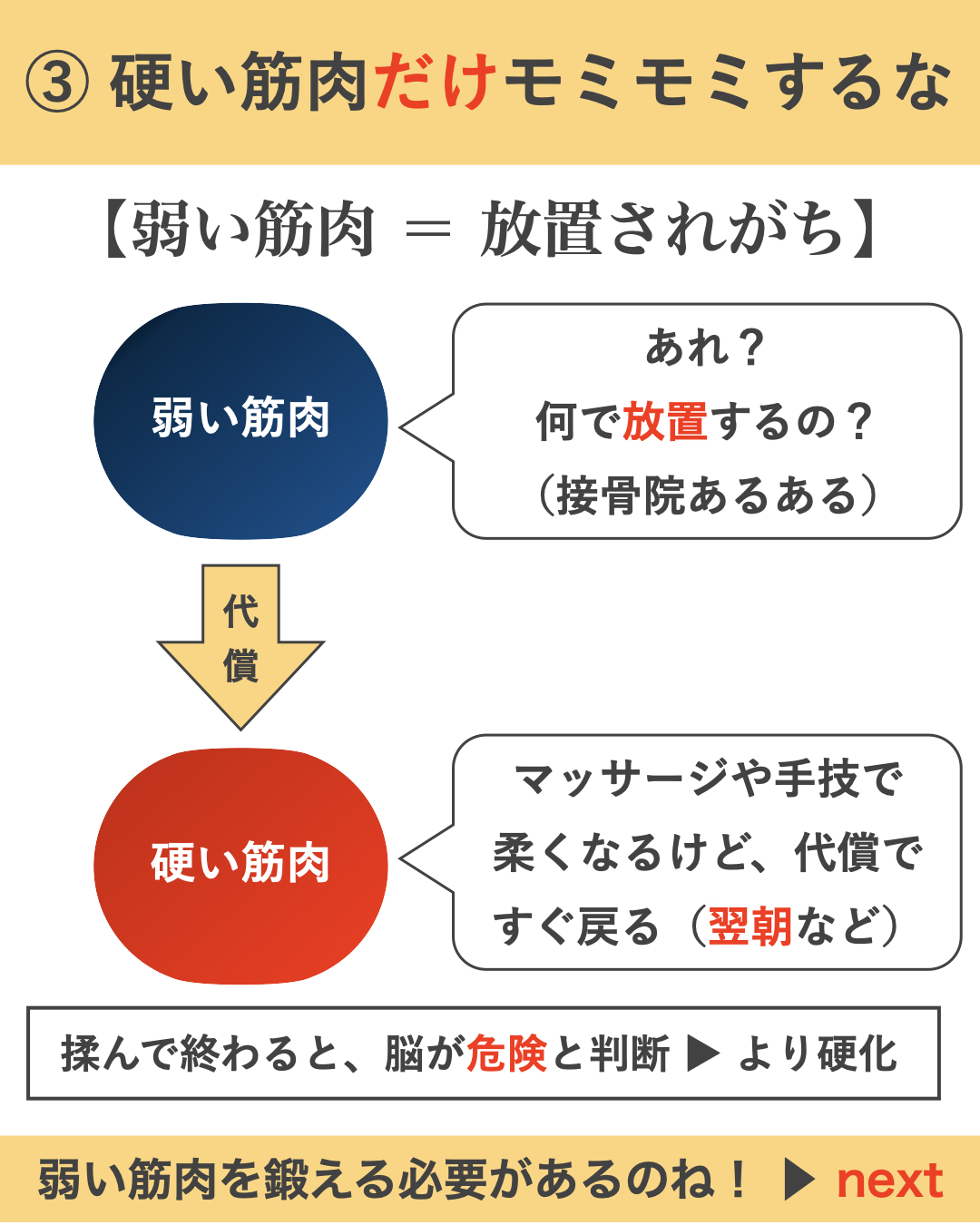 つまり、痛い場所や患部以外の固まった筋肉をモミモミして施術が終わっているから、弱い筋肉は放置されたままとなり、